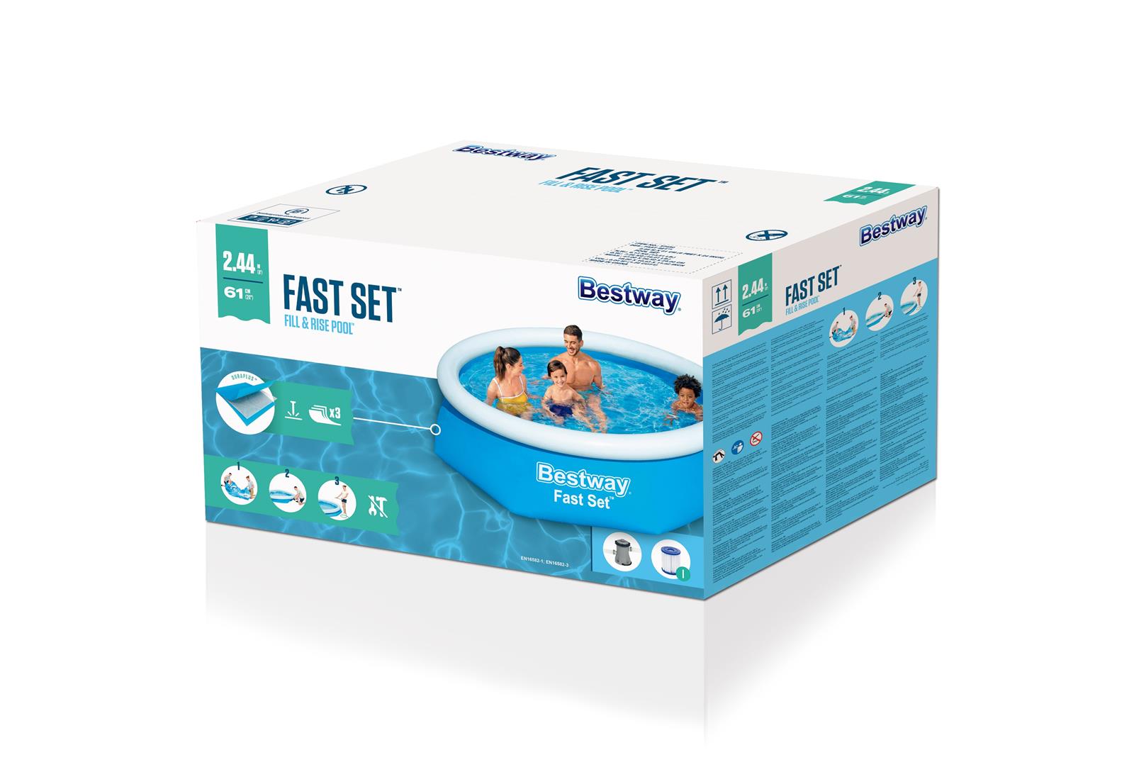 Großartiges Poolvergnügen im Turbotempo: Dieser Fast Set™ Pool von Bestway baut sich auf einer ebenen Oberfläche durch den aufgepumpten Luftring in Windeseile selbst auf, ohne dass die Werkzeugkiste zum Einsatz kommen muss. Durch die Maße von 244 x 61cm/305 x 66cm passen insgesamt 1.880 Liter / 3.200 Liter Wasser (80 % Auslastung) in den leuchtend blauen Swimmingpool. Das robuste, 3-lagige DuraPlus-Material sorgt für Festigkeit & lange Haltbarkeit, um unzählige Stunden Urlaubsgefühl für die ganze Familie nach Hause zu holen. Bei kleinen Rissen oder Makeln hilft der im Set enthaltene, inklusive Reparaturflicken sofort. Kristallklares Wasser ist ein Muss: Deshalb ist der Pool mit einer Flowclear Filterpumpe (1.249 l/h) & der passenden Kartusche ausgestattet, um den Inhalt des Swimmingpools effektiv & optimal zu reinigen. Nach der erfrischenden Badesaison kann durch das praktische Ablassventil & dem enthaltenen Gartenschlauchadapter das Wasser problemlos an gewünschter Stelle abgelassen werden. Ähnlich funktional & intuitiv ist auch der Transport & die Lagerung des Schwimmbeckens – besser geht’s nicht! Dieses Produkt von Bestway® ist zudem mit zwei Jahren Herstellergarantie abgesichert.